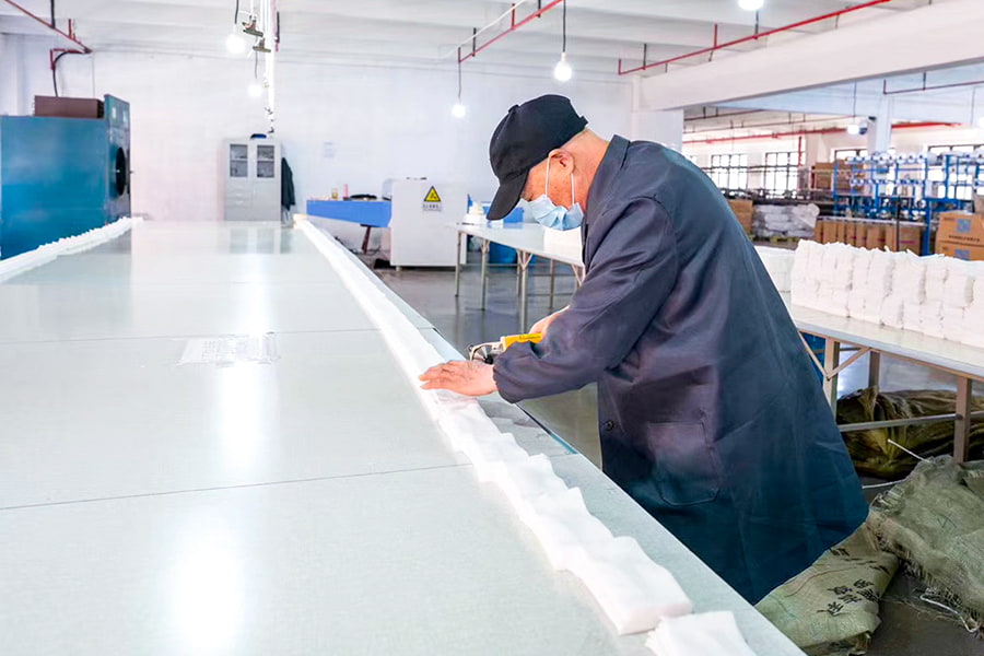 تحسين عملية القطع: أثناء عملية الانكماش، حدد عوامل الانكماش المناسبة وظروف الانكماش وفقًا لمادة القماش (مثل القطن والصوف والمخلوط وما إلى ذلك). تستخدم أقمشة الصوف تقنية انكماش الإنزيم الحيوي الخفيفة لتقليل تلف الألياف والحفاظ على بريقها ونعومتها الطبيعية؛ في حين أن أقمشة الألياف الاصطناعية قد تستخدم الانكماش الميكانيكي مع الكواشف الكيميائية المحددة لتحقيق التماسك والمرونة المثاليين. من خلال التحكم الدقيق في وقت الانكماش ودرجة الحرارة، يمكن تحسين ملمس الأقمشة المزخرفة المحبوكة المضلعة مع تجنب التأثيرات السلبية للانكماش المفرط.
